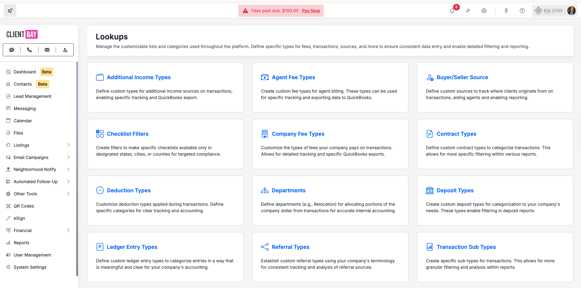 Lookups are used to create dropdown menu items in your transactions. Lookups essentially enable you to create customizable fields. Some Lookups are available to be used in different reports.