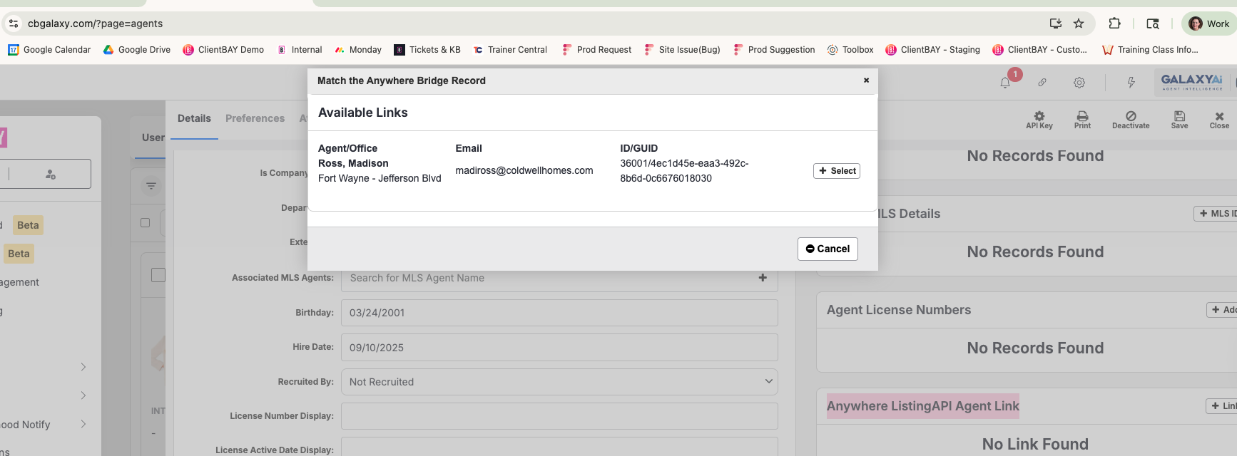 - A pop-up will appear with a potential match. If the agent is a match, click Select and then Link the agent.