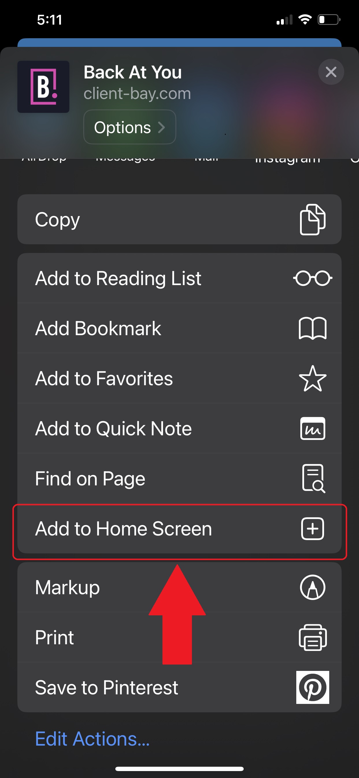 4. Scroll down to the list of Actions and tap "Add to Home Screen"
