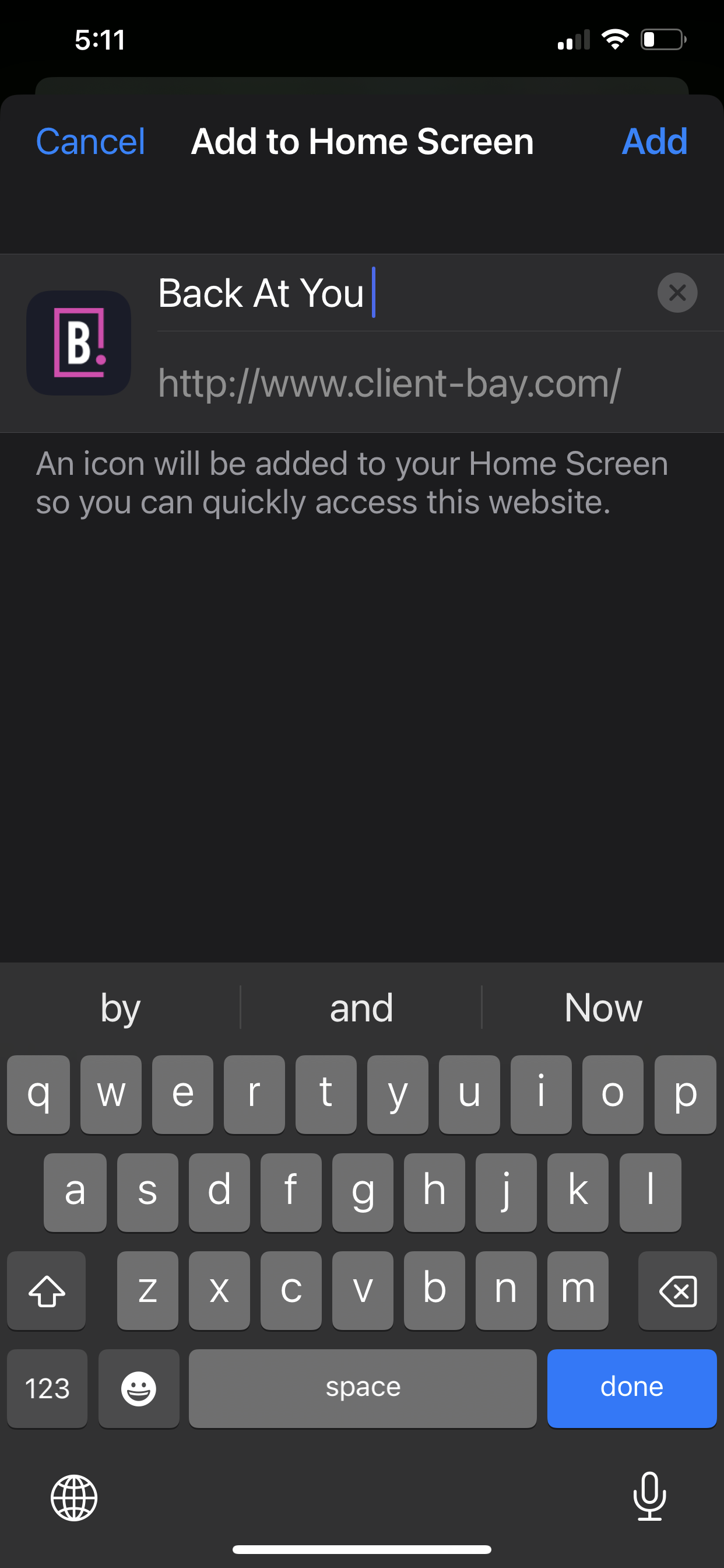 4. You will then have the opportunity to edit the title of the icon. Once you have the title, tap Add to transfer it to the the home screen.